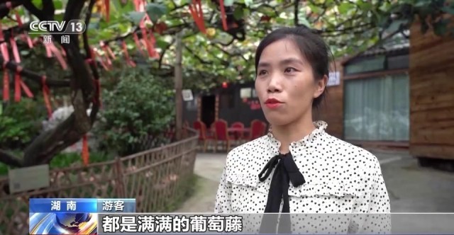 游客:我们住的民宿里都是满满的葡萄藤,这棵是上百年的葡萄王,一边住一边玩还能走走逛逛。