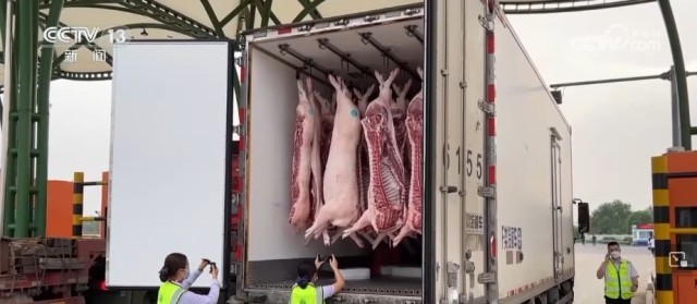 为了保障肉品质量,在这家保供基地生猪屠宰后,会马上进入预冷车间,预冷2小时之后再转运到冷链车上,运输全程制冷。另外,当地政府和运管部门也同步强化服务,在检疫、运输、转运等多个环节提供便利。