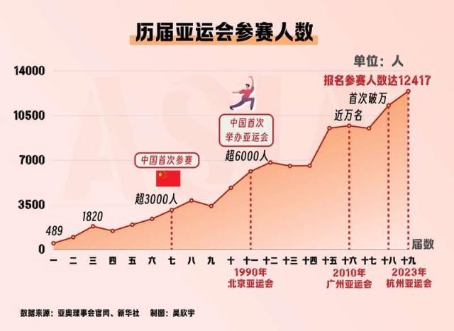 从489到12417,越来越多亚洲国家和地区的运动员参与到亚洲最高水平的体育盛会中,“我们亚洲”在世界体坛的影响力正在逐渐扩大。