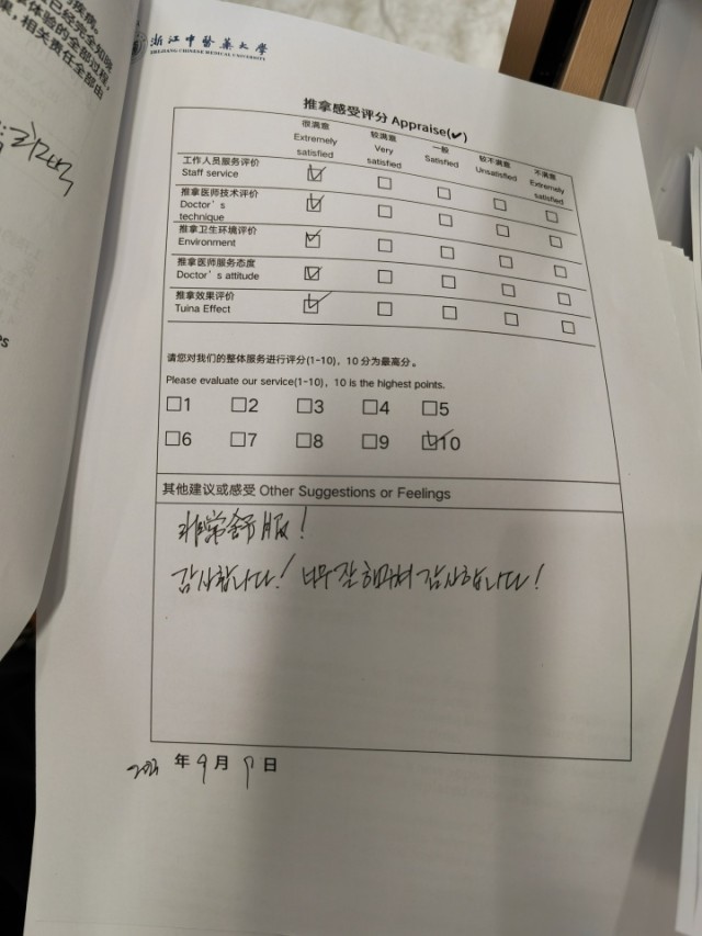 韩国KBS一位记者体验后,满分好评,还在评分表上用中文和韩文分别写下:“非常舒服,谢谢,(推拿手法)做得非常好,十分感谢......”