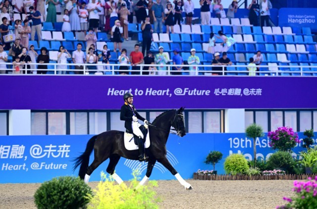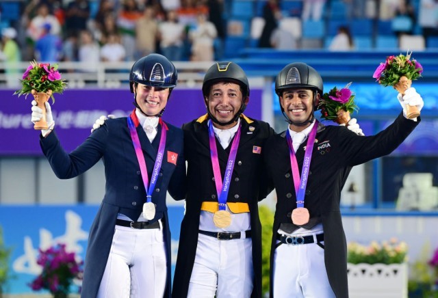 “今天对我来说太重要了,我的妻子、孩子在场边目睹了这一刻,这是一场永远值得回忆的比赛。我等这枚金牌已经25年了,以前我只获得过铜牌和银牌。”安巴克不仅实现了个人突破,也赢得了马来西亚马术项目的第一块亚运金牌。