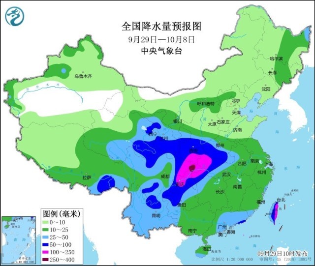 9月30日至10月2日,陕西南部、四川东部、贵州北部、重庆、湖北、河南南部等地的部分地区将有中到大雨。