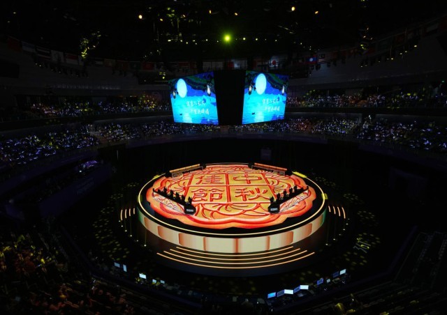 9月29日,杭州电竞中心赛场上的巨型月饼。新华社记者 韩传号 摄