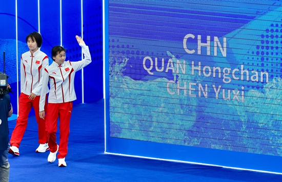 9月30日,杭州亚运会跳水女子双人10米台决赛,中国选手全红婵(右)/陈芋汐夺冠。视觉中国供图