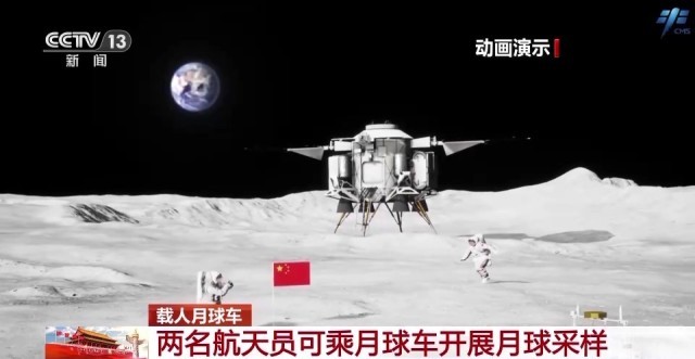 月面着陆器到达月面后,航天员将乘坐月球车,在月面开展工作。载人月球车重约200公斤,可搭乘两名航天员,航天员将乘着月球车在10公里的范围之内开展月球采样。