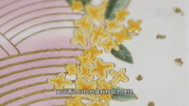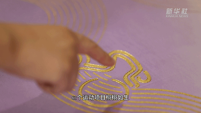 61个运动项目栩栩如生,串联在完整的画面之中。画心两边以杭城金秋桂花为缠绕,向亚运徽标飘入一片片的金桂。