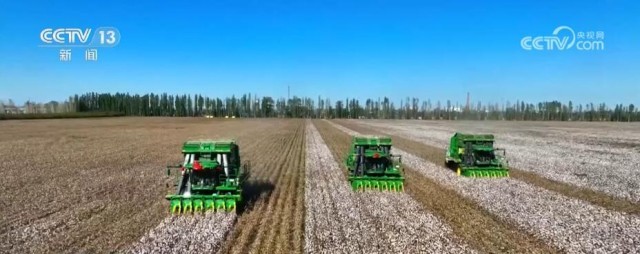 玛纳斯县南靠天山山脉,土壤肥沃,光热水土资源丰富,适宜种植棉花,是新疆的重要棉花产区,也是国家级优质商品棉生产基地,今年当地棉花种植面积74万亩。在玛纳斯县凉州户镇吕家庄村的万亩棉田里,三台新引进的棉花采收打包一体机正在采收棉花,采棉机能够高效快速地将棉花从棉秆上脱离,采净率高达95%以上,一台采棉机平均每天可采收700多亩棉花,相当于1000名拾花工劳动量的总和。