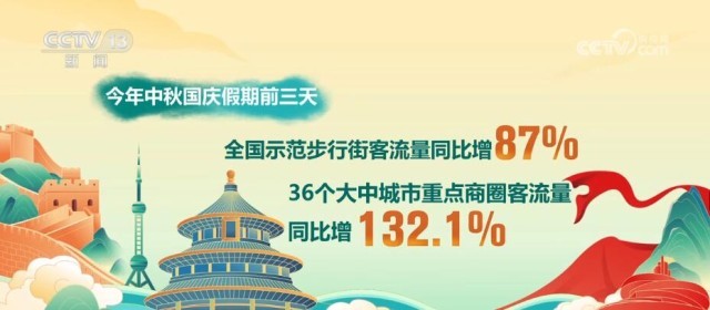 商务部数据显示,假期前三天,重点商圈人气红火。全国示范步行街客流量同比增长87%,36个大中城市重点商圈客流量同比增长132.1%。