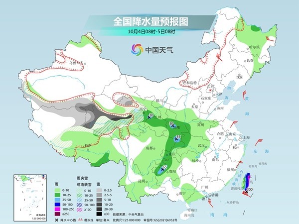 未来三天(10月4日至6日),华西秋雨连连,部分地区有中到大雨,局地暴雨,陕西、河南、湖北、重庆等地前期雨量已经明显偏多,需防范次生灾害。青海、西藏等部分地区今明天有较强降雪,局地有暴雪,需注意做好防御措施。气温方面,受冷空气影响,假期后半段,我国南北方气温都将大面积刷新立秋后的新低,东北、西北等地天气寒凉,公众请注意保暖。