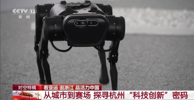 总台记者 夏周:这两天在杭州亚运会的赛场上,一只只机器狗吸引了大家的注意力,大家评论说这一只只机器狗“立大功”了,它们不仅仅可以运球拍、捡铁饼、还能够充当“拉拉队”,这些机器狗的老家就在杭州。