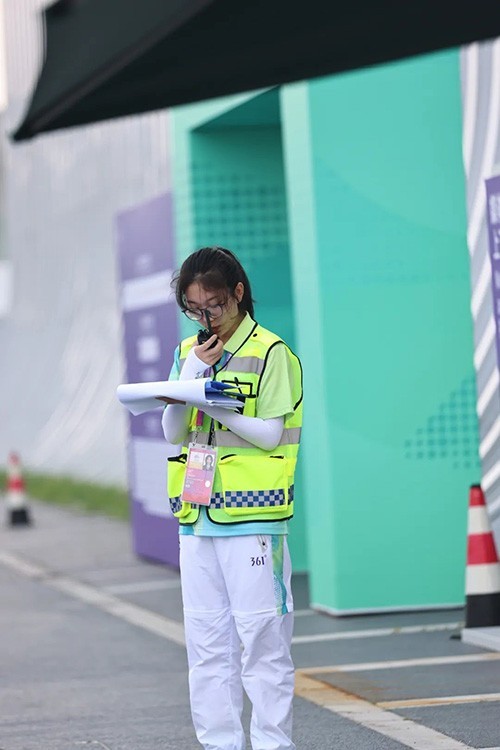 在赛程前半段,天气特别冷并且阵雨绵绵,余海兰穿了短袖、长袖、外套和雨衣,最外层还穿了荧光警服。尽管裹了五层,但室外的温度只减不增,还有雨丝飘进伞棚。她只好站起来,搓着手,用最原始的“摩擦生热”让自己暖和一些。在赛程的后半段,冷空气退去,高温重返。余海兰值的是下午岗,在室外顶着烈日开展服务。她认真记录到达与离开车辆的信息、时间与人数,及时用对讲机向交通领域的工作人员汇报。繁琐重复的工作一直进行着,但她从不喊累。在送完最后一班媒体班车离开后,已是晚上近十点。