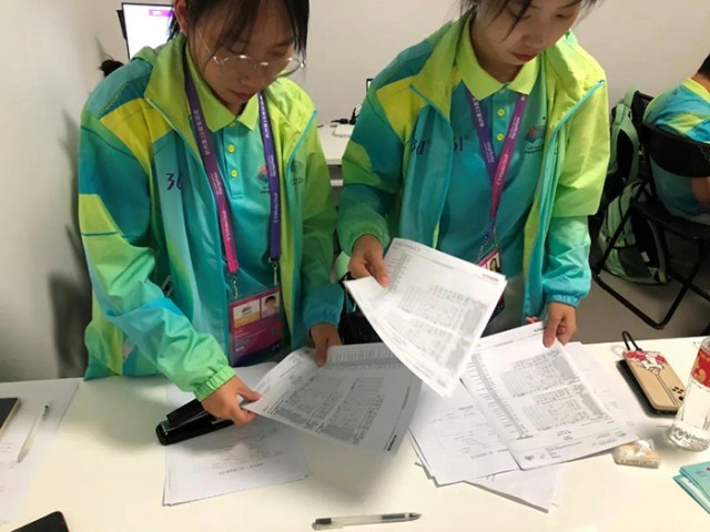 每场比赛结束人们欢呼喝彩之时,是成绩分发志愿者最忙碌的时候。信息技术领域志愿者蒋卓涵说:“成绩是每场比赛后大家最关心的事,第一时间将报表递送给目标客户是我们最重要的任务。”每天,她都承担着清点、分配各领域报表的任务。