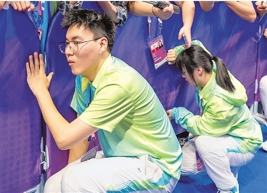 蹲下身子,用身体作盾墙,使尽全身力气护住铁马……每天中午12时和晚上8时左右,在奥体中心游泳馆混采区,都会上演这一幕。来自中国计量大学的“小青荷”杨子航,总是会吸引大家的目光。