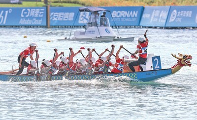 10月4日,杭州亚运会龙舟项目女子组12人龙舟200米直道竞速赛,中国体育代表团选手在比赛中。