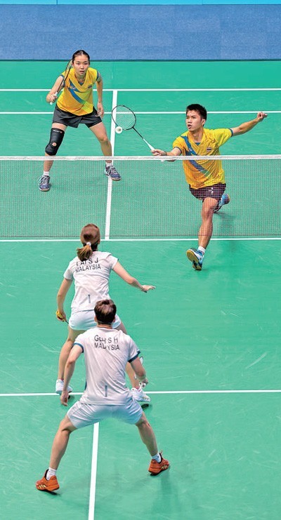 10月4日,杭州亚运会羽毛球混合双打1/8决赛,马来西亚体育代表团组合对阵泰国体育代表团组合。图为双方运动员在比赛中。