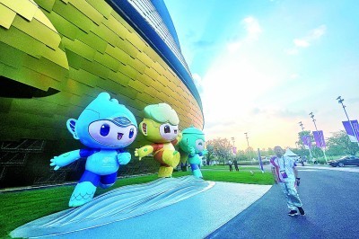 拱墅运河体育公园体育馆外的杭州亚运会吉祥物。本报记者 陈茵摄/光明图片