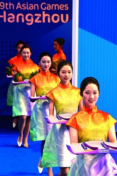 9月30日,亚运会跳水项目颁奖仪式上,礼仪人员手托装有奖牌的托盘,面带笑容走向颁奖台。本报记者 杨震摄/光明图片