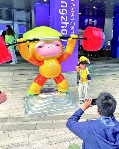 10月5日,亚运会举重场馆外,观众争相与吉祥物合影,一位小朋友特意摆出与吉祥物“琮琮”一样的举重姿势合影留念。本报记者 杨震摄/光明图片