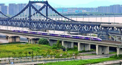 10月3日,亚运涂装复兴号智能动车组从杭州东站发出,穿过钱塘江。本报记者 陈城摄/光明图片