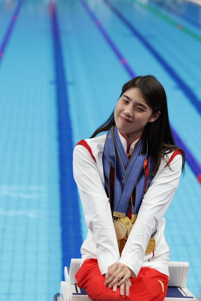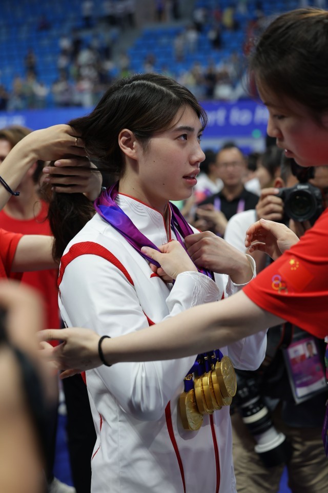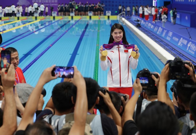 杭州亚运会已经接近尾声,10月7日晚杭州亚组委召开新闻发布会,宣布中国游泳运动员张雨霏、覃海洋共同荣膺本届亚运会“长龙航空”最有价值运动员。张雨霏在本届亚运会游泳项目上狂揽6金,并打破多项亚运会和亚洲纪录,其中在男女4×100米混合接力项目中,还和队友共同打破了亚洲纪录。覃海洋同样表现出色,本届亚运会共获得5金1银。不过,张雨霏和覃海洋都未亲临新闻发布会现场,在结束杭州亚运会的比赛之后,两人已前往柏林参加世界泳联世界杯的比赛,中国游泳队的队友王一淳、王长浩在发布会上代领了最有价值奖杯。亚奥理事会代理主席拉贾·兰迪尔·辛格、亚奥理事会终身名誉副主席魏纪中、亚奥理事会代理总干事维诺德·库马尔·帝瓦里等领导和嘉宾出席了今晚的新闻发布会。魏纪中表示,亚运会最有价值运动员评选,是根据运动成绩包括打破纪录的情况、体育精神、影响力和公平竞赛等方面综合评定的。(中青报·中青网记者 杨屾/文 李隽辉摄)