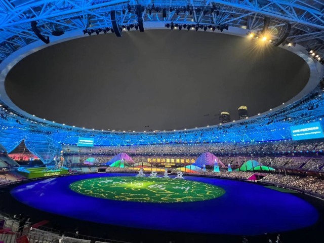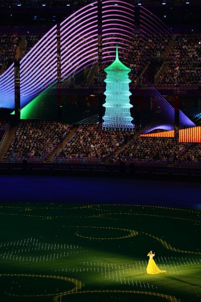 10月8日晚,月儿在天边慢慢升起,洒脱的钱塘江风缓缓吹过杭州奥体中心体育场,亚洲主视线投向灯光璀璨的“大莲花”内。9月23日晚这里点燃的亚运之火还在北侧火炬台上跳跃,今晚以《最忆是杭州》为主题的闭幕式亦将于20时准时开始:开幕式后15个比赛日,40大项61分项481小项,其中包括31个奥运项目、9个非奥项目,亚洲全部45个国家与地区代表团11830名运动员、随队官员5711人,汇聚杭州书写下全亚洲“山水相连、人文相亲”的历史情谊。今晚走进“大莲花”的观众,在《亚洲雄风》和《爱达未来》、《梦想天堂》歌声中,开始期待和享受这一场盛会曲终人散情不散、心不散的炽热情感。(中青报·中青网记者 郭剑文/李隽辉摄)