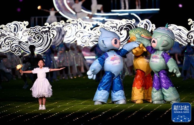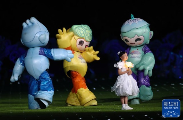 ↑杭州亚运会吉祥物在闭幕式上表演。新华社记者 宋彦桦 摄