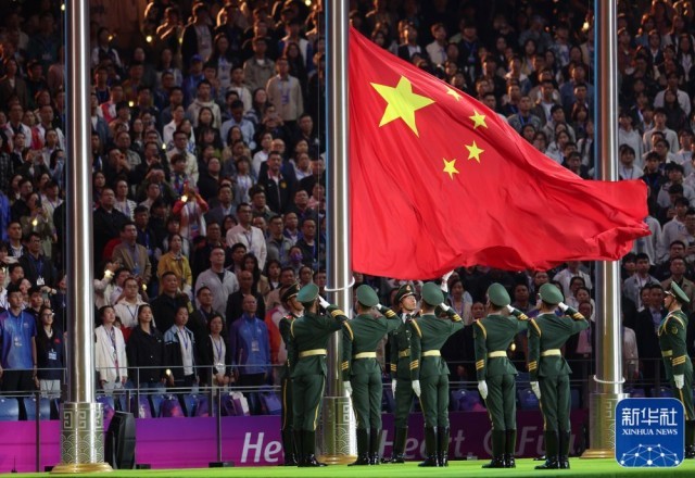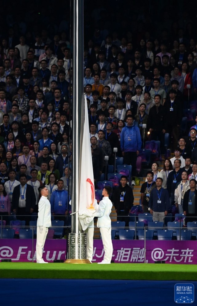 ↑中华人民共和国国旗在闭幕式上升起。新华社记者 孟晨光 摄
