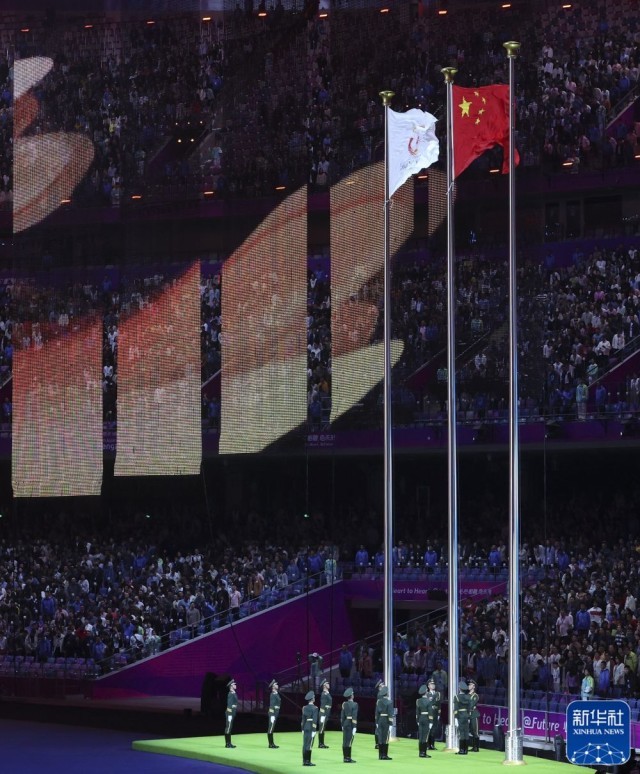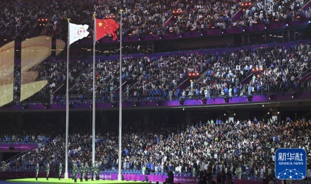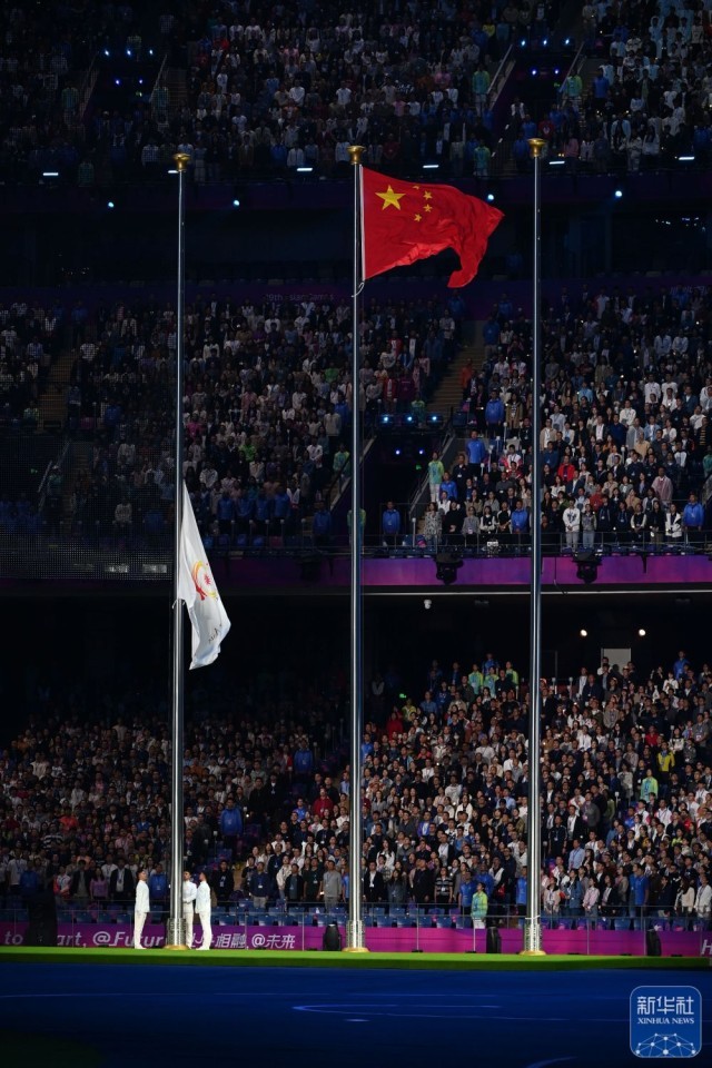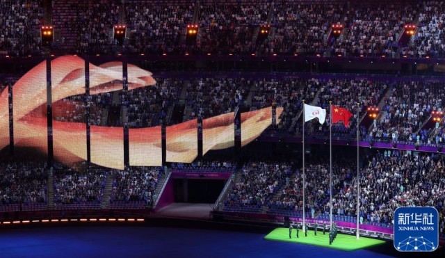 ↑中华人民共和国国旗在闭幕式上升起。新华社记者 杨冠宇 摄
