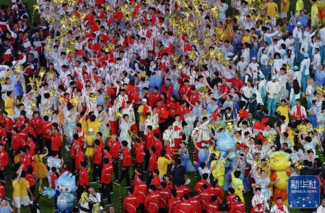 ↑各体育代表团旗帜、运动员在闭幕式上入场。新华社记者 薛宇舸 摄