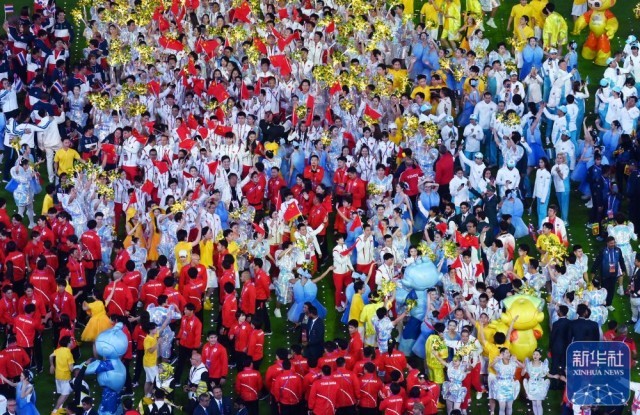 ↑各代表团在闭幕式上入场。新华社记者 徐昱 摄