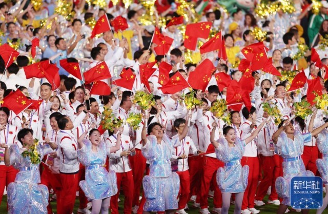 ↑中国代表团成员在闭幕式上挥舞国旗。新华社记者 张涛 摄