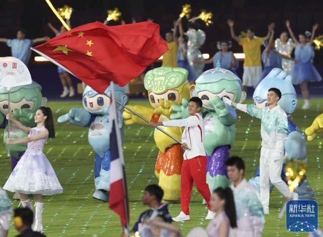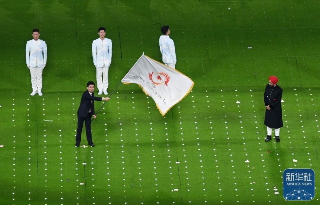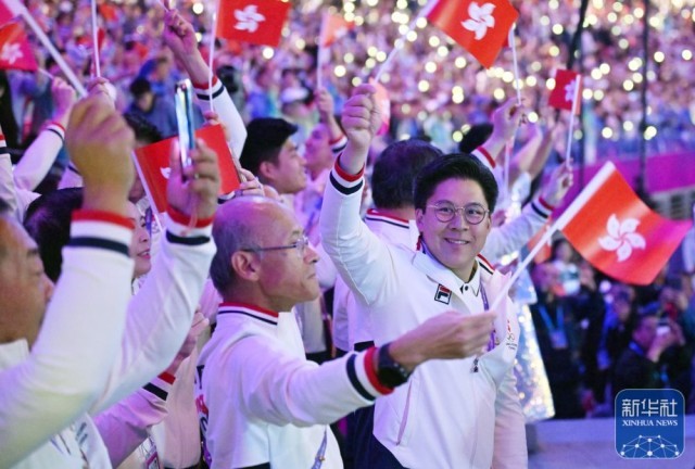 ↑中国香港体育代表团旗手在闭幕式上入场。新华社记者 单宇琦 摄