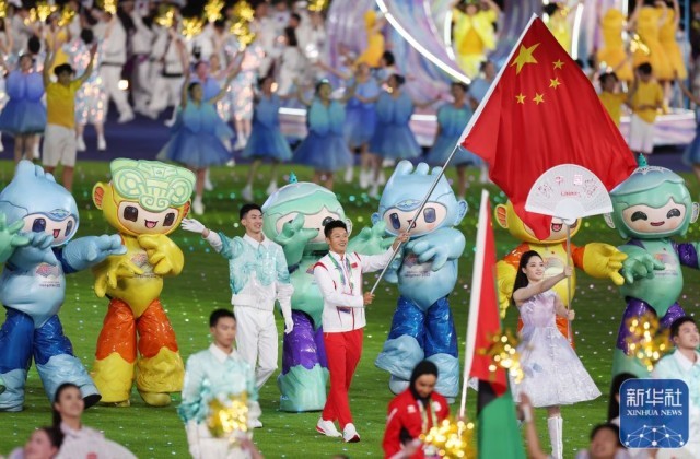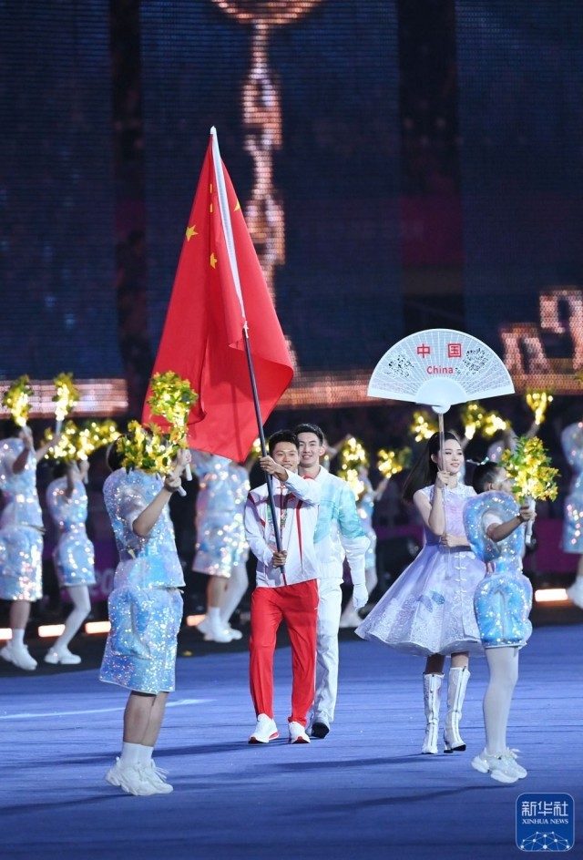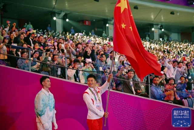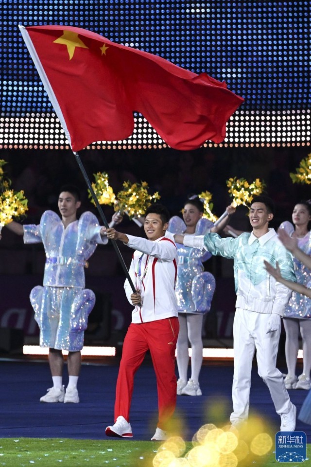 ↑中国代表团旗手谢震业在闭幕式上入场。新华社记者 陈钟昊 摄
