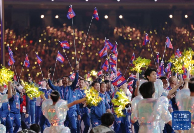 ↑柬埔寨体育代表团在闭幕式上入场。新华社记者 张涛 摄