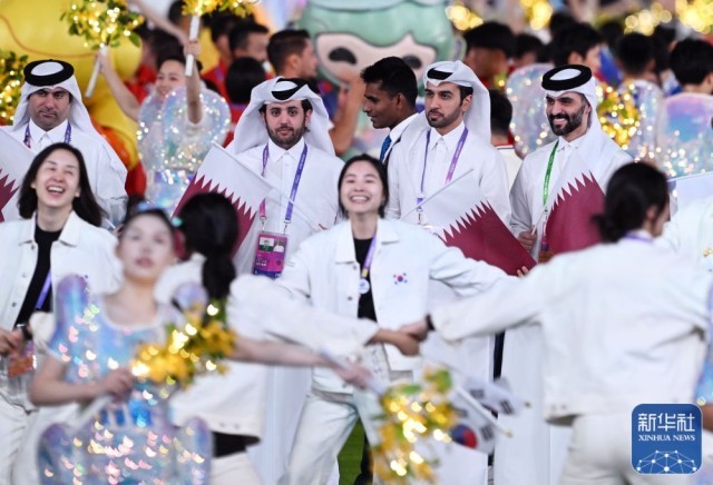 ↑卡塔尔代表团在闭幕式上入场。新华社记者 程敏 摄
