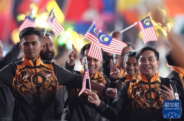 ↑马来西亚体育代表团在闭幕式上入场。新华社记者 张涛 摄