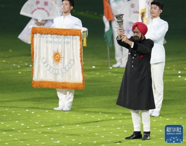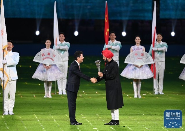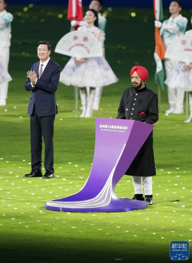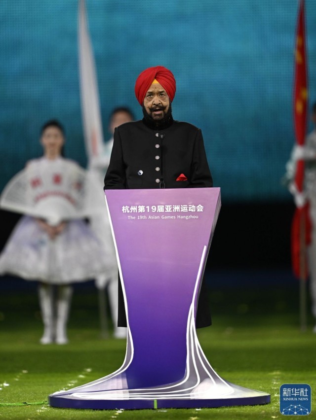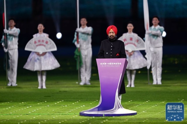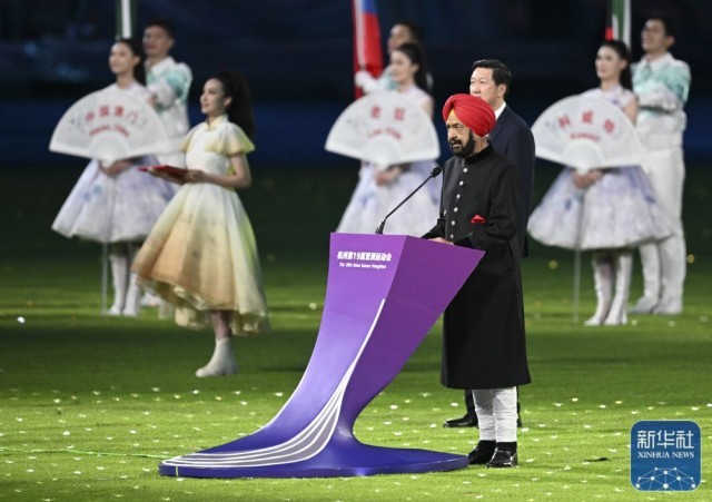 ↑亚奥理事会代理主席拉贾·兰迪尔·辛格在闭幕式上致辞。新华社记者 杨冠宇 摄