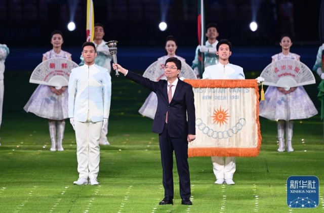 ↑亚奥理事会代理主席辛格在闭幕式上致辞。新华社记者 宋彦桦 摄