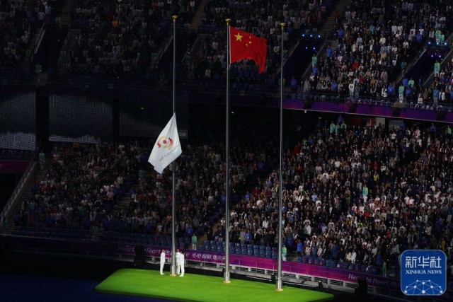 ↑亚奥理事会会旗在闭幕式上降下。新华社记者 杨磊 摄
