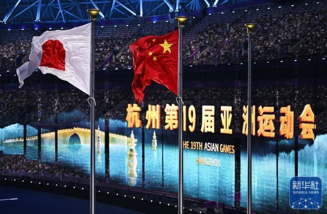 ↑下一届亚运会主办国日本国旗在闭幕式上升起。新华社记者 黄宗治 摄