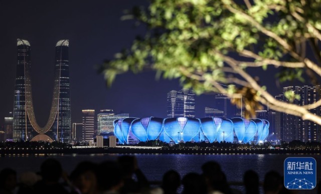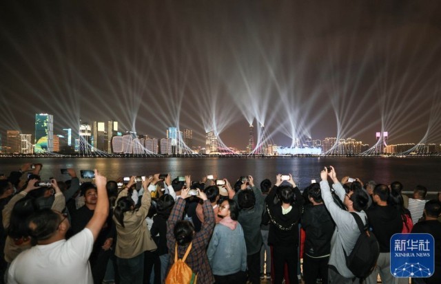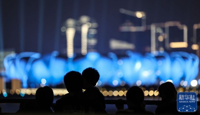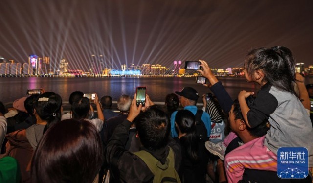 ↑观众在拍摄杭州夜景。新华社记者 潘昱龙 摄