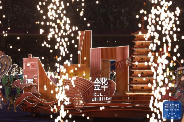 ↑金华花车出现在闭幕式现场。新华社记者 张涛 摄