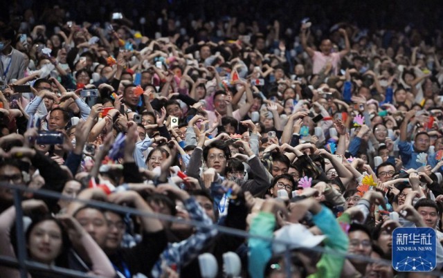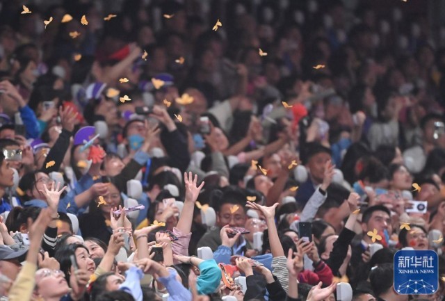 ↑观众在闭幕式上接住飘落的“桂花”。新华社记者 颜麟蕴 摄