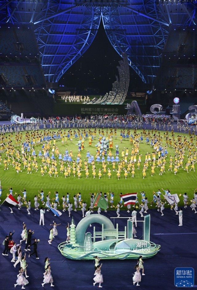 ↑湖州花车出现在闭幕式现场。新华社记者 王鹏 摄