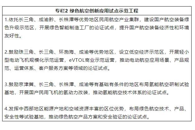 7.推动新能源航空器区域应用试点示范。依托优势地区,建设国产航空装备绿色升级示范区。鼓励各地区结合区域经济发展基础和需求,开展电动通航飞机、eVTOL试点示范应用,探索技术和装备体系、应用场景、商业运营新模式。鼓励有基础有条件的地区布局绿色航空关键技术、产品方案、安全验证等试验基地。