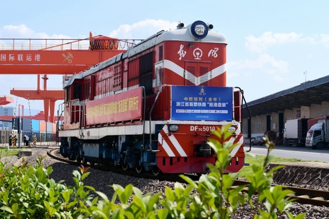 △2023年9月9日,浙江金华,一批当地企业生产的散热器等货物搭乘中欧班列驶往中亚五国。