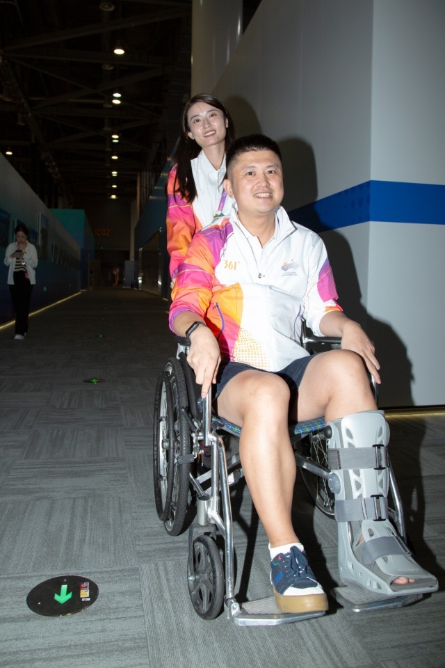 MMC主媒体中心,一位志愿者推着另一位因伤坐在轮椅上的志愿者。