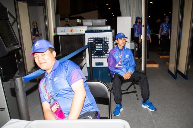 MMC主媒体中心安检口,害羞躲避记者镜头的志愿者。