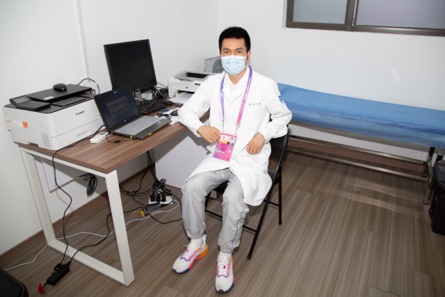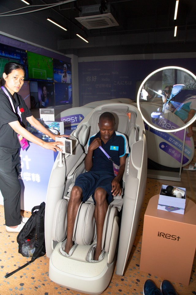 运动员村工作人员正在向外国代表团成员介绍按摩体验流程。