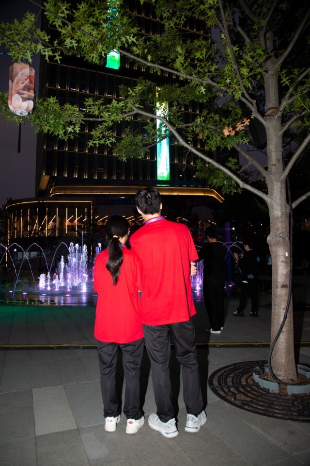 运动员村,中秋前夕工作人员欣赏音乐喷泉。